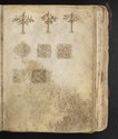 Trois arbres héraldiques fleuris et arrachés ; cinq entrelacs géométriquesDessin