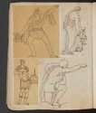 Album Gatteaux dit "musée imaginaire". Album factice à couverture en vélin. Feuillets de deux papiers différents du fait de l'usage d'un papier plus fort et moins homogène pour le premier feuillet, puis du folio 36 recto au folio 40 verso. Au total 599 dessins répartis sur les premiers 134 feuillets. 596 dessins collés sur les pages de l'album et 3 dessins exécutés à même les pages de l'album. 592 dessins rapportés exécutés sur calque et 4 dessins rapportés exécutés sur papier. 23 dessins exécutés uniquement au graphite sur papier ou calque. 24 dessins exécutés à l'encre brune et/ou noire sur traces de graphite.552 dessins exécutés à l'encre seule, majoritairement brune mais de qualités différentes, parfois plus grise, d'autres fois plus noire. Plusieurs ensembles de feuillets vierges : du folio 30 recto au folio 35 verso inclus ; du folio 65 verso au feuillet 68 recto inclus ; du feuillet 72 verso au 75 verso inclus ; du feuillet 129 recto au feuillet 130 verso inclus. Feuillets vierges ou coupés à partir du folio 135 verso. Annotation à la plume et à l'encre brune de la main de Jacques-Edouard Gatteaux sur la contre-garde de la couverture: " E. Gatteaux. Rue de Bourbon n° 36 / Paris". Dimensions de l'album : H. 21 cm.; L. 17 cm. ; épaisseur du dos environ 3,2 cm.