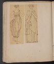 Album Gatteaux dit "musée imaginaire". Album factice à couverture en vélin. Feuillets de deux papiers différents du fait de l'usage d'un papier plus fort et moins homogène pour le premier feuillet, puis du folio 36 recto au folio 40 verso. Au total 599 dessins répartis sur les premiers 134 feuillets. 596 dessins collés sur les pages de l'album et 3 dessins exécutés à même les pages de l'album. 592 dessins rapportés exécutés sur calque et 4 dessins rapportés exécutés sur papier. 23 dessins exécutés uniquement au graphite sur papier ou calque. 24 dessins exécutés à l'encre brune et/ou noire sur traces de graphite.552 dessins exécutés à l'encre seule, majoritairement brune mais de qualités différentes, parfois plus grise, d'autres fois plus noire. Plusieurs ensembles de feuillets vierges : du folio 30 recto au folio 35 verso inclus ; du folio 65 verso au feuillet 68 recto inclus ; du feuillet 72 verso au 75 verso inclus ; du feuillet 129 recto au feuillet 130 verso inclus. Feuillets vierges ou coupés à partir du folio 135 verso. Annotation à la plume et à l'encre brune de la main de Jacques-Edouard Gatteaux sur la contre-garde de la couverture: " E. Gatteaux. Rue de Bourbon n° 36 / Paris". Dimensions de l'album : H. 21 cm.; L. 17 cm. ; épaisseur du dos environ 3,2 cm.