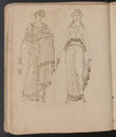 Album Gatteaux dit "musée imaginaire". Album factice à couverture en vélin. Feuillets de deux papiers différents du fait de l'usage d'un papier plus fort et moins homogène pour le premier feuillet, puis du folio 36 recto au folio 40 verso. Au total 599 dessins répartis sur les premiers 134 feuillets. 596 dessins collés sur les pages de l'album et 3 dessins exécutés à même les pages de l'album. 592 dessins rapportés exécutés sur calque et 4 dessins rapportés exécutés sur papier. 23 dessins exécutés uniquement au graphite sur papier ou calque. 24 dessins exécutés à l'encre brune et/ou noire sur traces de graphite.552 dessins exécutés à l'encre seule, majoritairement brune mais de qualités différentes, parfois plus grise, d'autres fois plus noire. Plusieurs ensembles de feuillets vierges : du folio 30 recto au folio 35 verso inclus ; du folio 65 verso au feuillet 68 recto inclus ; du feuillet 72 verso au 75 verso inclus ; du feuillet 129 recto au feuillet 130 verso inclus. Feuillets vierges ou coupés à partir du folio 135 verso. Annotation à la plume et à l'encre brune de la main de Jacques-Edouard Gatteaux sur la contre-garde de la couverture: " E. Gatteaux. Rue de Bourbon n° 36 / Paris". Dimensions de l'album : H. 21 cm.; L. 17 cm. ; épaisseur du dos environ 3,2 cm.