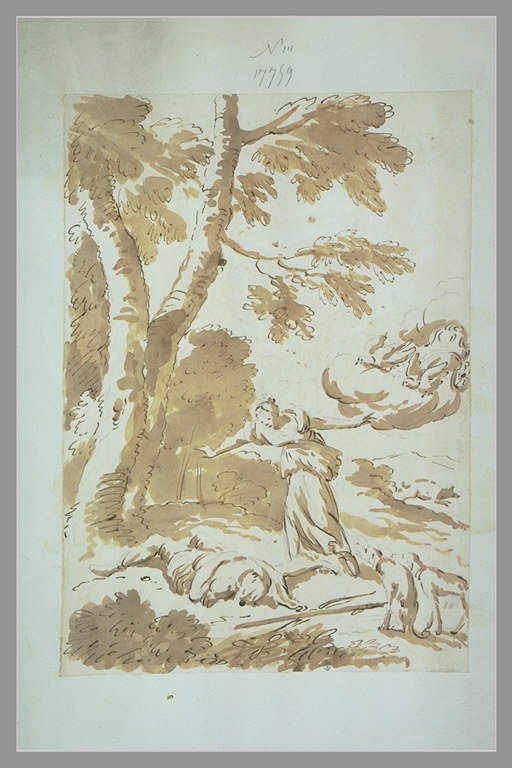 Une femme et deux chiens auprès d'un homme étendu, dans un paysage: Pyrame et Thisbé?