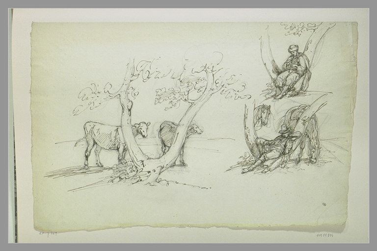 Vaches derrière un arbre ; deux études d'un homme endormi sur un arbre
