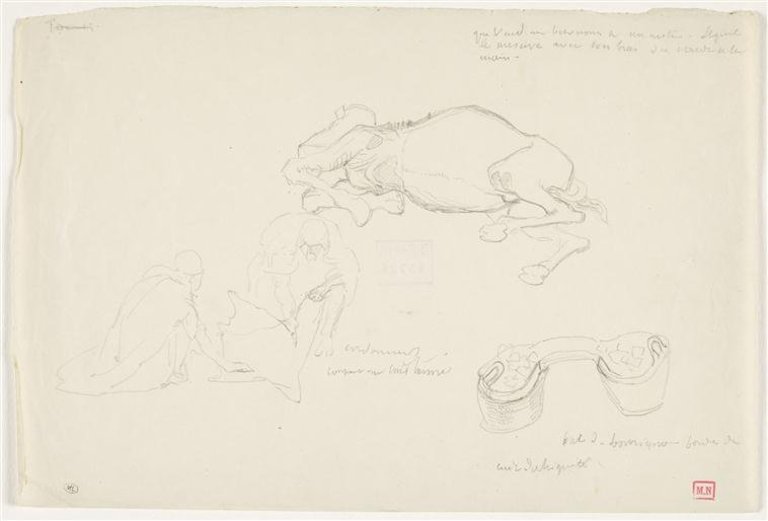 Deux arabes découpant du cuir ; cheval étendu ; bât d'âne