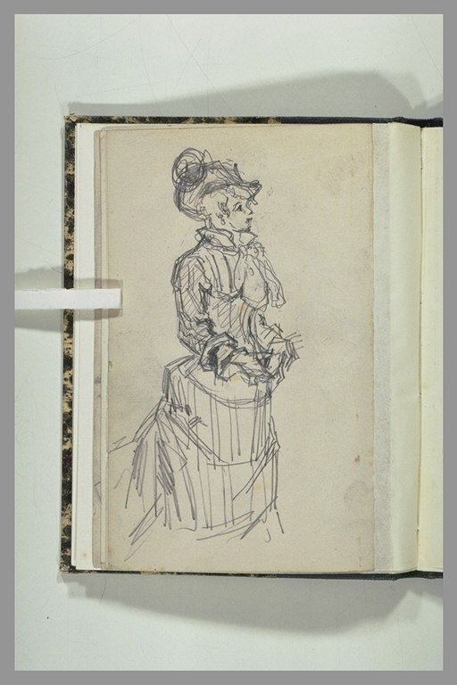Une femme debout, vue de profil, coiffée d'un chapeau
