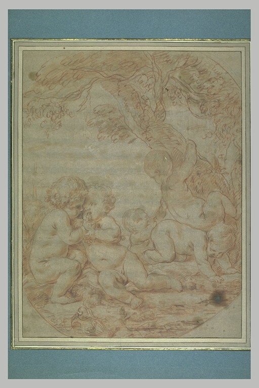 Des enfants nus, jouant et mangeant des fruits sous un arbre