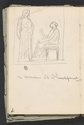 Carnet de croquis, à couverture cartonnée, de papier marbré bleu et noir, à dos de toile marron-rouge, comprenant 42 folios. Trois dessins sont rapportés, dont celui dessiné sur une enveloppe, ou ancienne couverture de ce carnet, (RF 23115.3) ; il offre différentes études de monuments dont celui à H. Regnault. Traces de feuillets déchirés. Traces de folios manquants entre la couverture et le folio 1 et entre les folios 8 et 9. H: 0,148 ; L: 0,095.