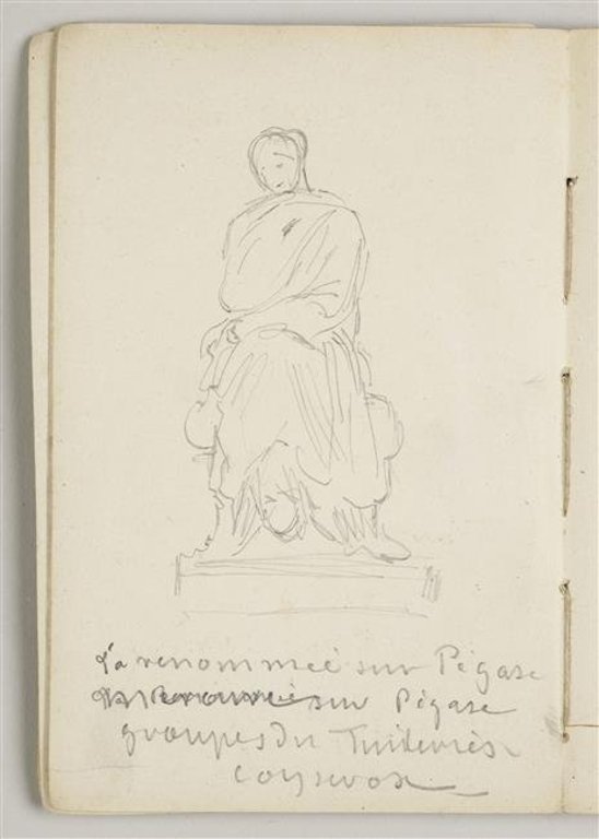 Femme drapée assise, étude de statue, et annotations manuscrites