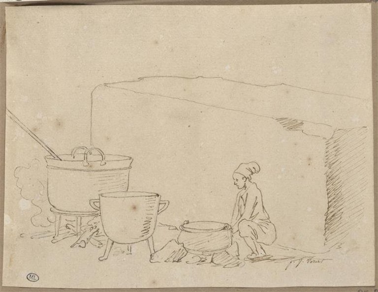 Un jeune homme accroupi surveillant trois marmites, devant une éorme pierre