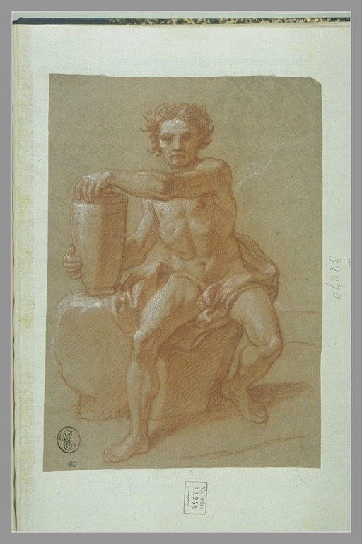 Un homme nu, assis sur un rocher, tenant un vase, vu de face
