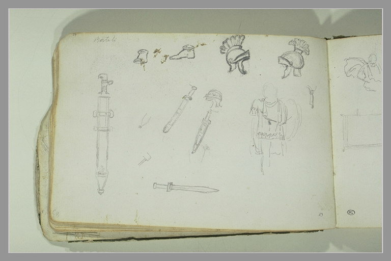 Etudes de casques, d'épées, d'une tunique et autres croquis