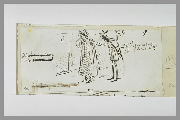 Caricature : femme pleurant près d'un homme en costume Louis XI