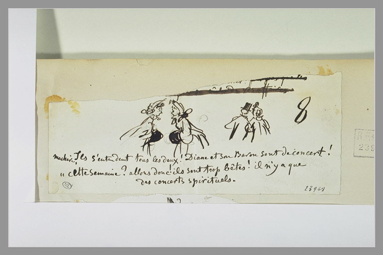 Caricature : deux dames conversant ensemble à propos d'un couple