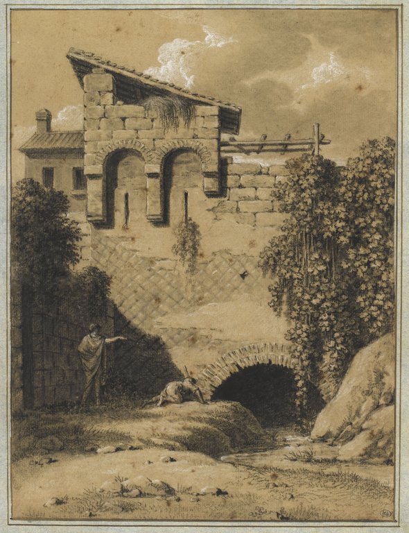 Deux figures près d'une bouche d'égoût passant sous une maison