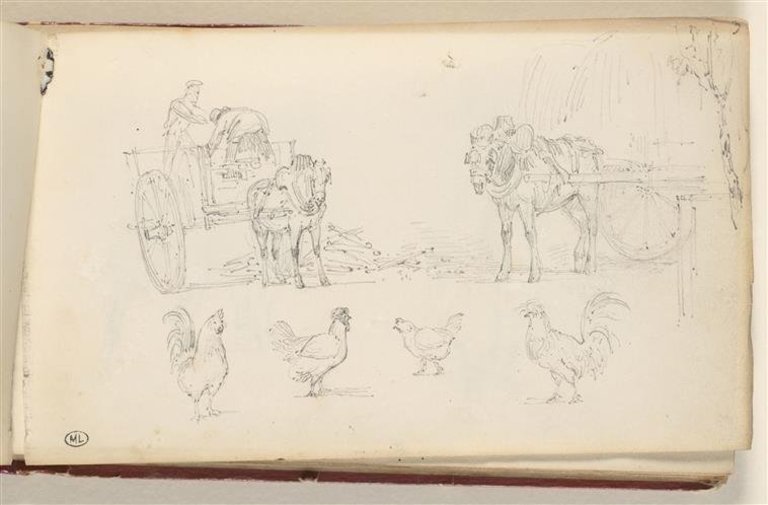 Deux études d'un cheval attelé à un tombereau ; études de poules