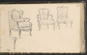 Etudes d'un fauteuil, d'une bergère et d'une chaise de style Louis XV ; détail d'un pied