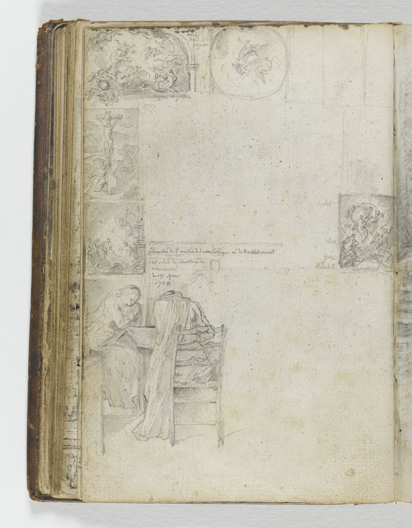Deux moines assis ; sur un mur, représentations de scènes religieuses
