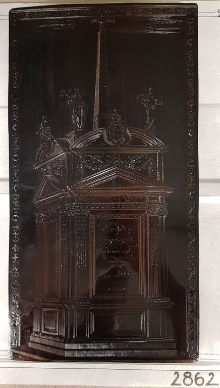 Pyramide aux armes de France et de Navarre, dressée devant la porte du Palais à Paris pour commémorer l'attentat de Jean Chastel, son châtiment et l'expulsion des Jésuites en 1594.