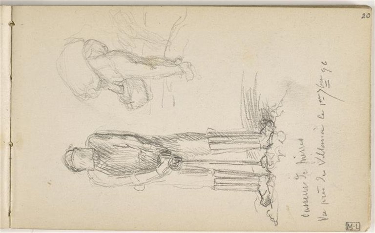 Ouvrier de face, appuyé sur une pioche et homme vu de dos, portant un panier et un ballot