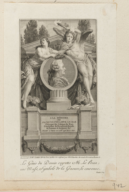 Le Génie du Dessin regrette M. Le Bas ; une Muse, Symbole de la Gravure, le couronne