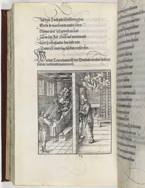73. Ein prunst im Franckenlandt dem hochgeborn Ritter Tewrdanck in seinem gemach begegnet under der Figur begriffen werden all ander prunst der Im in seinem hin und wider raissen aus unfleis vil todlich unnd sorgfeltiglich begegnet sein.