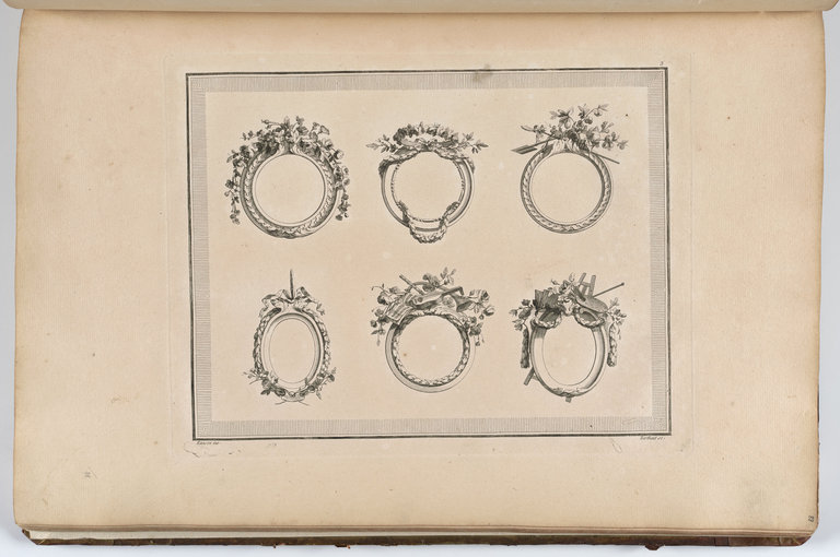 Oeuvres contenant un recueil de trophées, attributs, cartouches, vases, fleurs ornemens Et plusieurs Desseins agréables pour broder des Fauteuils ; Composés et dessinés par Ranson, et gravés par Berthaut et Voysard. 1778.
