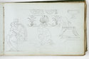 Crayon noir, lavis, plume. Signé 'PJF' en deuxième de couverture. Album recouvert de parchemin vert, comportant 55 feuillets et deux petits dessins détachés. 'Chaque folio a été annoté au verso avec un numéro commençant par '1102.A'. Ces numéros vont de 1102.A.1 à 1102.A.56, ils correspondent aux 54 folios de l'album plus les deux dessins non reliés (une femme drapée et un fauteuil) conservés dans l"album. Si l'on de réfère aux photo de l'album faites par François Lauginie (sans date de prise de vue) sur lesquelles ne figurent pas ces numéros, il semblerait donc que ces ces numéros, inscrits au crayon à papier, aient été rajoutés récemment. Aucune dégradation par rapport au récolement précédent h'est à signaler' (Rapport de mission de récolement effectué par Mélanie Budin (SR Louvre), 20-21 mai 2019).