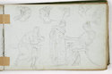 Crayon noir, lavis, plume. Signé 'PJF' en deuxième de couverture. Album recouvert de parchemin vert, comportant 55 feuillets et deux petits dessins détachés. 'Chaque folio a été annoté au verso avec un numéro commençant par '1102.A'. Ces numéros vont de 1102.A.1 à 1102.A.56, ils correspondent aux 54 folios de l'album plus les deux dessins non reliés (une femme drapée et un fauteuil) conservés dans l"album. Si l'on de réfère aux photo de l'album faites par François Lauginie (sans date de prise de vue) sur lesquelles ne figurent pas ces numéros, il semblerait donc que ces ces numéros, inscrits au crayon à papier, aient été rajoutés récemment. Aucune dégradation par rapport au récolement précédent h'est à signaler' (Rapport de mission de récolement effectué par Mélanie Budin (SR Louvre), 20-21 mai 2019).