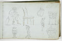 Crayon noir, lavis, plume. Signé 'PJF' en deuxième de couverture. Album recouvert de parchemin vert, comportant 55 feuillets et deux petits dessins détachés. 'Chaque folio a été annoté au verso avec un numéro commençant par '1102.A'. Ces numéros vont de 1102.A.1 à 1102.A.56, ils correspondent aux 54 folios de l'album plus les deux dessins non reliés (une femme drapée et un fauteuil) conservés dans l"album. Si l'on de réfère aux photo de l'album faites par François Lauginie (sans date de prise de vue) sur lesquelles ne figurent pas ces numéros, il semblerait donc que ces ces numéros, inscrits au crayon à papier, aient été rajoutés récemment. Aucune dégradation par rapport au récolement précédent h'est à signaler' (Rapport de mission de récolement effectué par Mélanie Budin (SR Louvre), 20-21 mai 2019).