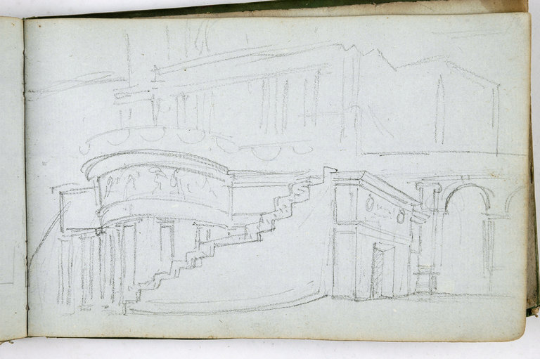 Etude d'architecture : façade de palais avec un escalier et une terrasse