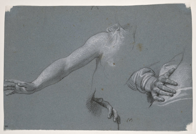 Etude pour Le bras droit et l'épaule de Suzanne dans Suzanne et les vieillards et deux mains : la main droite du vieillard de gauche sur les hanches de Suzanne ; l'autre posée sur une draperie (folio 11)
