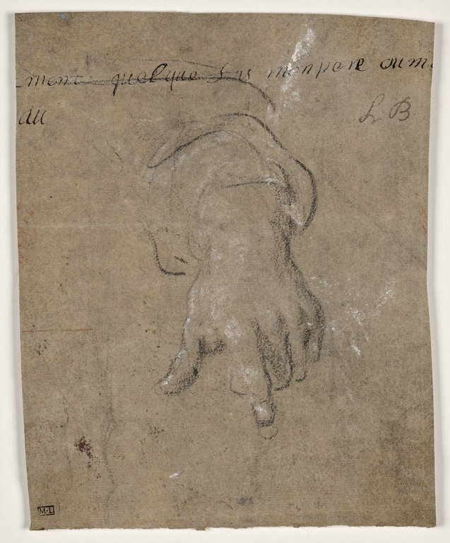 Etude de main gauche en raccourci, l'index pointé (folio 76, en bas à gauche)