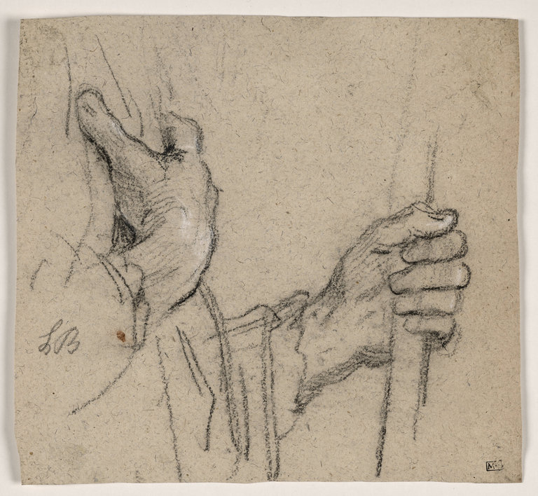 Deux études de mains, l'une posée sur une poitrine, l'autre tenant un bâton (folio 83, au milieu à droite)