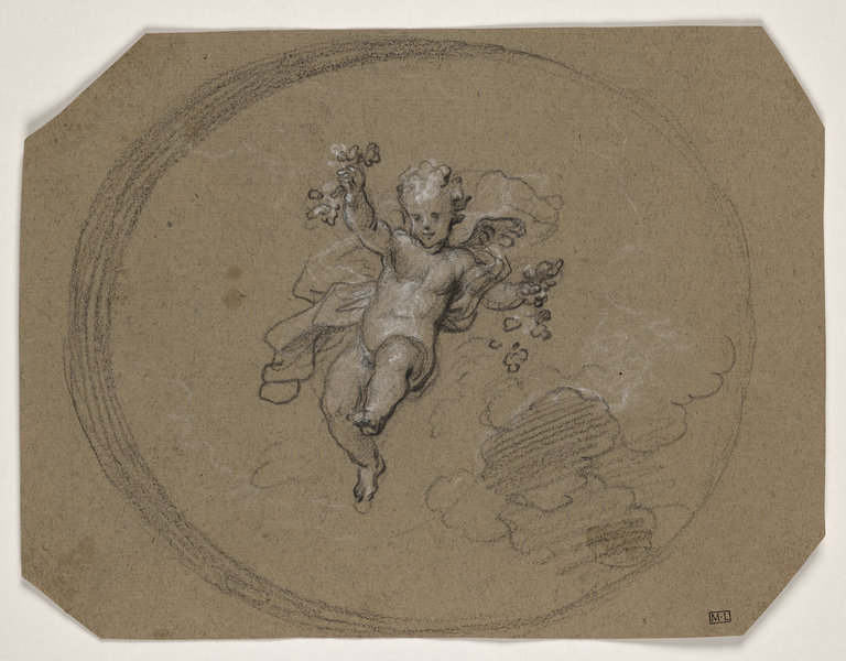 Putto en vol tenant des guirlandes de fleurs (folio 89, en bas)