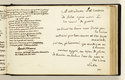 Liber amicorum de la princesse de Salm, composé entre le 1er janvier 1809 et 1841. Reliure d'origine en chagrin ébène, plats ornés d'un encadrement à froid. Sur le plat supérieur, inscription en lettres dorées "Album", surmontée du chiffre "C.S" couronné. Dos lisse orné de filets à froid, doublure et gardes de papier moiré, tranches dorées (reliure d'époque). Dédié par Constance Salm à ses amis et "A TOUS CEUX QUI AIMENT OU CULTIVENT LES LETTRES, LES SCIENCES OU LES ARTS". Toutes les pages sont montées sur onglet. Environ 331 pages numérotées à l'encre rouge et au crayon de 1 à 186 et 189 à 331, entre les pages 186 et 189, 20 feuillets lettrés A à T. Manquent les pages 125, 126, 149, 150, 187, 188, 265, 266. Pas de page 80. Sont vierges les pages 1, 6, 34, 68, 71, 78, 92, 100, 104, 106, 110, 114, 116, 117, 130, 138, 140, 141, 144, 146, 148, 152, 153, 156, 157, 184, 185, 198, 208, 212, 222, 224, 230, 232, 234, 236, 238, 246, 250, 254, 258, 286, 294, 298, 300, 302, 304, 306, 307, 310, 314, 316, 322, 324, 326, 327, 330. Une feuille volante se rapportant au dessin du folio 59. Petit in-8 oblong : Hauteur : 13,5 cm ; Longueur : 21,5 cm.