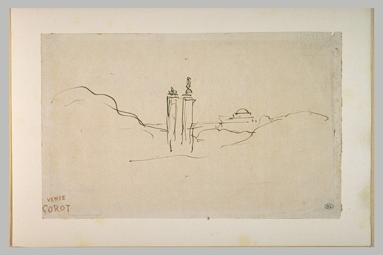 Deux colonnes surmontées de statues, un coupole au loin, dans un paysage