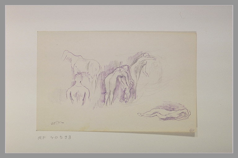 Divers croquis : figures ; femme nue se penchant vers un enfant ; cheval