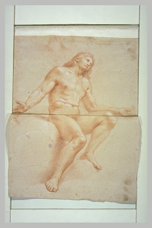 Homme nu, aux longs cheveux, assis sur des nuages, bras ouverts