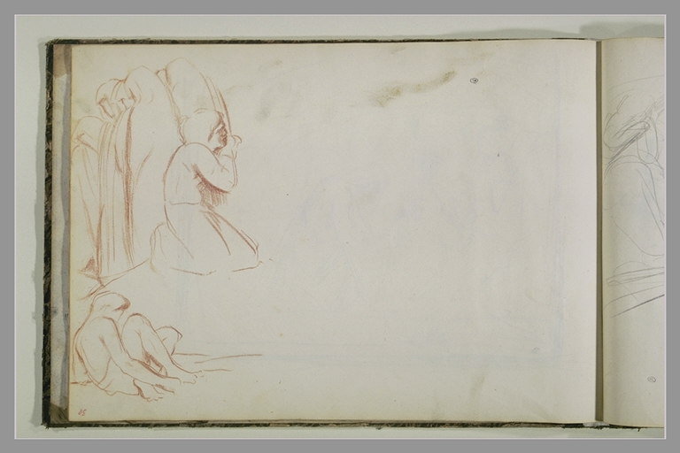 Femmes, debout, voilées ; homme agenouillé ; homme assis à terre