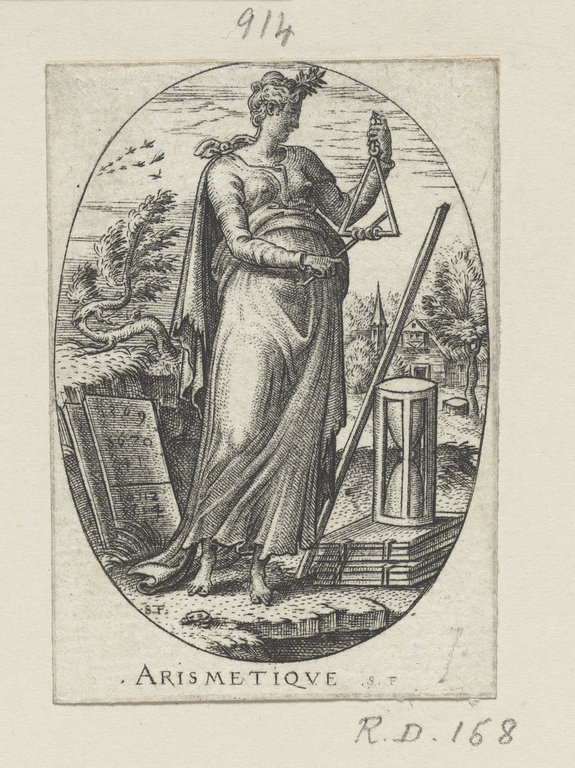 Les principales sciences plus Minerve et la Sagesse, représentées par des femmes debout dans des paysages - Arismétique