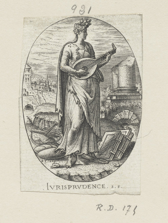 Les principales sciences plus Minerve et la Sagesse, représentées par des femmes debout dans des paysages - Iurisprudence