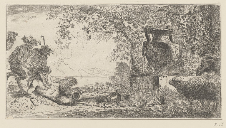 Satyre couché devant un grand vase