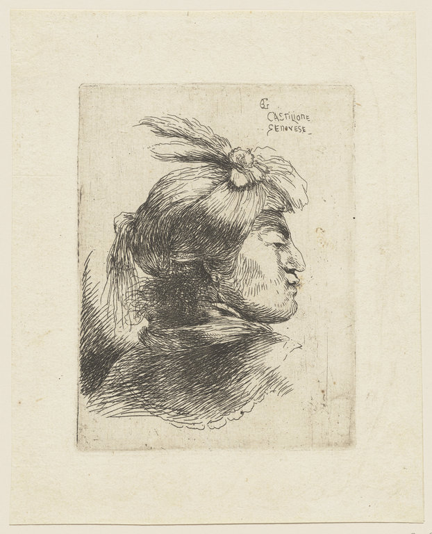 Homme barbu portant un petit turban orné de plumes et d'un ruban, de profil vers la droite