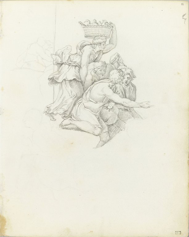 Groupe de personnages avec une femme portant sur la tête un panier avec des poussins