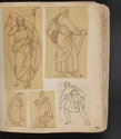 Album Gatteaux dit "musée imaginaire". Album factice à couverture en vélin. Feuillets de deux papiers différents du fait de l'usage d'un papier plus fort et moins homogène pour le premier feuillet, puis du folio 36 recto au folio 40 verso. Au total 599 dessins répartis sur les premiers 134 feuillets. 596 dessins collés sur les pages de l'album et 3 dessins exécutés à même les pages de l'album. 592 dessins rapportés exécutés sur calque et 4 dessins rapportés exécutés sur papier. 23 dessins exécutés uniquement au graphite sur papier ou calque. 24 dessins exécutés à l'encre brune et/ou noire sur traces de graphite.552 dessins exécutés à l'encre seule, majoritairement brune mais de qualités différentes, parfois plus grise, d'autres fois plus noire. Plusieurs ensembles de feuillets vierges : du folio 30 recto au folio 35 verso inclus ; du folio 65 verso au feuillet 68 recto inclus ; du feuillet 72 verso au 75 verso inclus ; du feuillet 129 recto au feuillet 130 verso inclus. Feuillets vierges ou coupés à partir du folio 135 verso. Annotation à la plume et à l'encre brune de la main de Jacques-Edouard Gatteaux sur la contre-garde de la couverture: " E. Gatteaux. Rue de Bourbon n° 36 / Paris". Dimensions de l'album : H. 21 cm.; L. 17 cm. ; épaisseur du dos environ 3,2 cm.