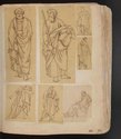 Album Gatteaux dit "musée imaginaire". Album factice à couverture en vélin. Feuillets de deux papiers différents du fait de l'usage d'un papier plus fort et moins homogène pour le premier feuillet, puis du folio 36 recto au folio 40 verso. Au total 599 dessins répartis sur les premiers 134 feuillets. 596 dessins collés sur les pages de l'album et 3 dessins exécutés à même les pages de l'album. 592 dessins rapportés exécutés sur calque et 4 dessins rapportés exécutés sur papier. 23 dessins exécutés uniquement au graphite sur papier ou calque. 24 dessins exécutés à l'encre brune et/ou noire sur traces de graphite.552 dessins exécutés à l'encre seule, majoritairement brune mais de qualités différentes, parfois plus grise, d'autres fois plus noire. Plusieurs ensembles de feuillets vierges : du folio 30 recto au folio 35 verso inclus ; du folio 65 verso au feuillet 68 recto inclus ; du feuillet 72 verso au 75 verso inclus ; du feuillet 129 recto au feuillet 130 verso inclus. Feuillets vierges ou coupés à partir du folio 135 verso. Annotation à la plume et à l'encre brune de la main de Jacques-Edouard Gatteaux sur la contre-garde de la couverture: " E. Gatteaux. Rue de Bourbon n° 36 / Paris". Dimensions de l'album : H. 21 cm.; L. 17 cm. ; épaisseur du dos environ 3,2 cm.