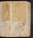 Album Gatteaux dit "musée imaginaire". Album factice à couverture en vélin. Feuillets de deux papiers différents du fait de l'usage d'un papier plus fort et moins homogène pour le premier feuillet, puis du folio 36 recto au folio 40 verso. Au total 599 dessins répartis sur les premiers 134 feuillets. 596 dessins collés sur les pages de l'album et 3 dessins exécutés à même les pages de l'album. 592 dessins rapportés exécutés sur calque et 4 dessins rapportés exécutés sur papier. 23 dessins exécutés uniquement au graphite sur papier ou calque. 24 dessins exécutés à l'encre brune et/ou noire sur traces de graphite.552 dessins exécutés à l'encre seule, majoritairement brune mais de qualités différentes, parfois plus grise, d'autres fois plus noire. Plusieurs ensembles de feuillets vierges : du folio 30 recto au folio 35 verso inclus ; du folio 65 verso au feuillet 68 recto inclus ; du feuillet 72 verso au 75 verso inclus ; du feuillet 129 recto au feuillet 130 verso inclus. Feuillets vierges ou coupés à partir du folio 135 verso. Annotation à la plume et à l'encre brune de la main de Jacques-Edouard Gatteaux sur la contre-garde de la couverture: " E. Gatteaux. Rue de Bourbon n° 36 / Paris". Dimensions de l'album : H. 21 cm.; L. 17 cm. ; épaisseur du dos environ 3,2 cm.