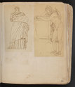 Album Gatteaux dit "musée imaginaire". Album factice à couverture en vélin. Feuillets de deux papiers différents du fait de l'usage d'un papier plus fort et moins homogène pour le premier feuillet, puis du folio 36 recto au folio 40 verso. Au total 599 dessins répartis sur les premiers 134 feuillets. 596 dessins collés sur les pages de l'album et 3 dessins exécutés à même les pages de l'album. 592 dessins rapportés exécutés sur calque et 4 dessins rapportés exécutés sur papier. 23 dessins exécutés uniquement au graphite sur papier ou calque. 24 dessins exécutés à l'encre brune et/ou noire sur traces de graphite.552 dessins exécutés à l'encre seule, majoritairement brune mais de qualités différentes, parfois plus grise, d'autres fois plus noire. Plusieurs ensembles de feuillets vierges : du folio 30 recto au folio 35 verso inclus ; du folio 65 verso au feuillet 68 recto inclus ; du feuillet 72 verso au 75 verso inclus ; du feuillet 129 recto au feuillet 130 verso inclus. Feuillets vierges ou coupés à partir du folio 135 verso. Annotation à la plume et à l'encre brune de la main de Jacques-Edouard Gatteaux sur la contre-garde de la couverture: " E. Gatteaux. Rue de Bourbon n° 36 / Paris". Dimensions de l'album : H. 21 cm.; L. 17 cm. ; épaisseur du dos environ 3,2 cm.