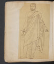 Album Gatteaux dit "musée imaginaire". Album factice à couverture en vélin. Feuillets de deux papiers différents du fait de l'usage d'un papier plus fort et moins homogène pour le premier feuillet, puis du folio 36 recto au folio 40 verso. Au total 599 dessins répartis sur les premiers 134 feuillets. 596 dessins collés sur les pages de l'album et 3 dessins exécutés à même les pages de l'album. 592 dessins rapportés exécutés sur calque et 4 dessins rapportés exécutés sur papier. 23 dessins exécutés uniquement au graphite sur papier ou calque. 24 dessins exécutés à l'encre brune et/ou noire sur traces de graphite.552 dessins exécutés à l'encre seule, majoritairement brune mais de qualités différentes, parfois plus grise, d'autres fois plus noire. Plusieurs ensembles de feuillets vierges : du folio 30 recto au folio 35 verso inclus ; du folio 65 verso au feuillet 68 recto inclus ; du feuillet 72 verso au 75 verso inclus ; du feuillet 129 recto au feuillet 130 verso inclus. Feuillets vierges ou coupés à partir du folio 135 verso. Annotation à la plume et à l'encre brune de la main de Jacques-Edouard Gatteaux sur la contre-garde de la couverture: " E. Gatteaux. Rue de Bourbon n° 36 / Paris". Dimensions de l'album : H. 21 cm.; L. 17 cm. ; épaisseur du dos environ 3,2 cm.