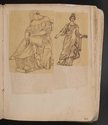 Album Gatteaux dit "musée imaginaire". Album factice à couverture en vélin. Feuillets de deux papiers différents du fait de l'usage d'un papier plus fort et moins homogène pour le premier feuillet, puis du folio 36 recto au folio 40 verso. Au total 599 dessins répartis sur les premiers 134 feuillets. 596 dessins collés sur les pages de l'album et 3 dessins exécutés à même les pages de l'album. 592 dessins rapportés exécutés sur calque et 4 dessins rapportés exécutés sur papier. 23 dessins exécutés uniquement au graphite sur papier ou calque. 24 dessins exécutés à l'encre brune et/ou noire sur traces de graphite.552 dessins exécutés à l'encre seule, majoritairement brune mais de qualités différentes, parfois plus grise, d'autres fois plus noire. Plusieurs ensembles de feuillets vierges : du folio 30 recto au folio 35 verso inclus ; du folio 65 verso au feuillet 68 recto inclus ; du feuillet 72 verso au 75 verso inclus ; du feuillet 129 recto au feuillet 130 verso inclus. Feuillets vierges ou coupés à partir du folio 135 verso. Annotation à la plume et à l'encre brune de la main de Jacques-Edouard Gatteaux sur la contre-garde de la couverture: " E. Gatteaux. Rue de Bourbon n° 36 / Paris". Dimensions de l'album : H. 21 cm.; L. 17 cm. ; épaisseur du dos environ 3,2 cm.