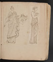 Album Gatteaux dit "musée imaginaire". Album factice à couverture en vélin. Feuillets de deux papiers différents du fait de l'usage d'un papier plus fort et moins homogène pour le premier feuillet, puis du folio 36 recto au folio 40 verso. Au total 599 dessins répartis sur les premiers 134 feuillets. 596 dessins collés sur les pages de l'album et 3 dessins exécutés à même les pages de l'album. 592 dessins rapportés exécutés sur calque et 4 dessins rapportés exécutés sur papier. 23 dessins exécutés uniquement au graphite sur papier ou calque. 24 dessins exécutés à l'encre brune et/ou noire sur traces de graphite.552 dessins exécutés à l'encre seule, majoritairement brune mais de qualités différentes, parfois plus grise, d'autres fois plus noire. Plusieurs ensembles de feuillets vierges : du folio 30 recto au folio 35 verso inclus ; du folio 65 verso au feuillet 68 recto inclus ; du feuillet 72 verso au 75 verso inclus ; du feuillet 129 recto au feuillet 130 verso inclus. Feuillets vierges ou coupés à partir du folio 135 verso. Annotation à la plume et à l'encre brune de la main de Jacques-Edouard Gatteaux sur la contre-garde de la couverture: " E. Gatteaux. Rue de Bourbon n° 36 / Paris". Dimensions de l'album : H. 21 cm.; L. 17 cm. ; épaisseur du dos environ 3,2 cm.